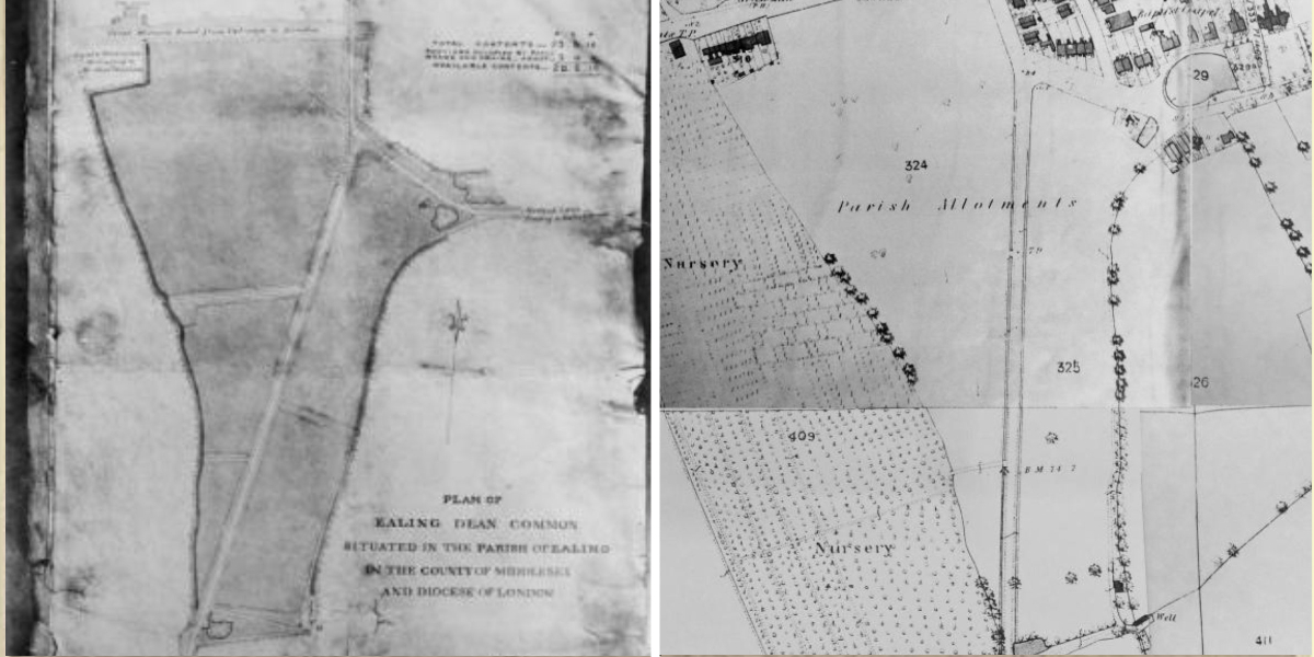 While we don't have any photographs of the site from that time, we do have a very useful map. The map (below left) shows Ealing Dean Common just before it was turned over to allotments for the 'industrious' or 'labouring' poor. A dwelling can be seen on the top right of the common which belonged to a Mr Hill. Ponds can be seen at the top right and bottom left of the common. A map from 1865 (below right) shows that both the ponds and the house were still there thirty years later.